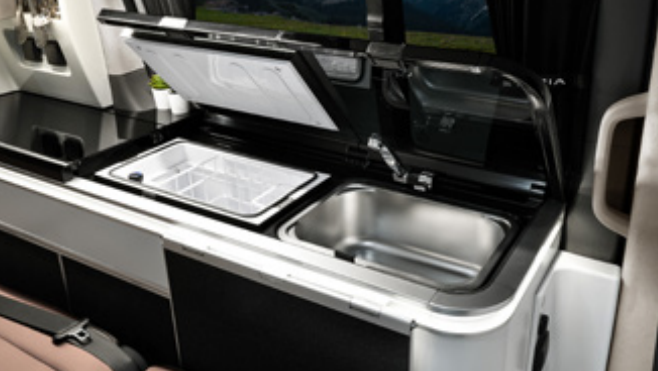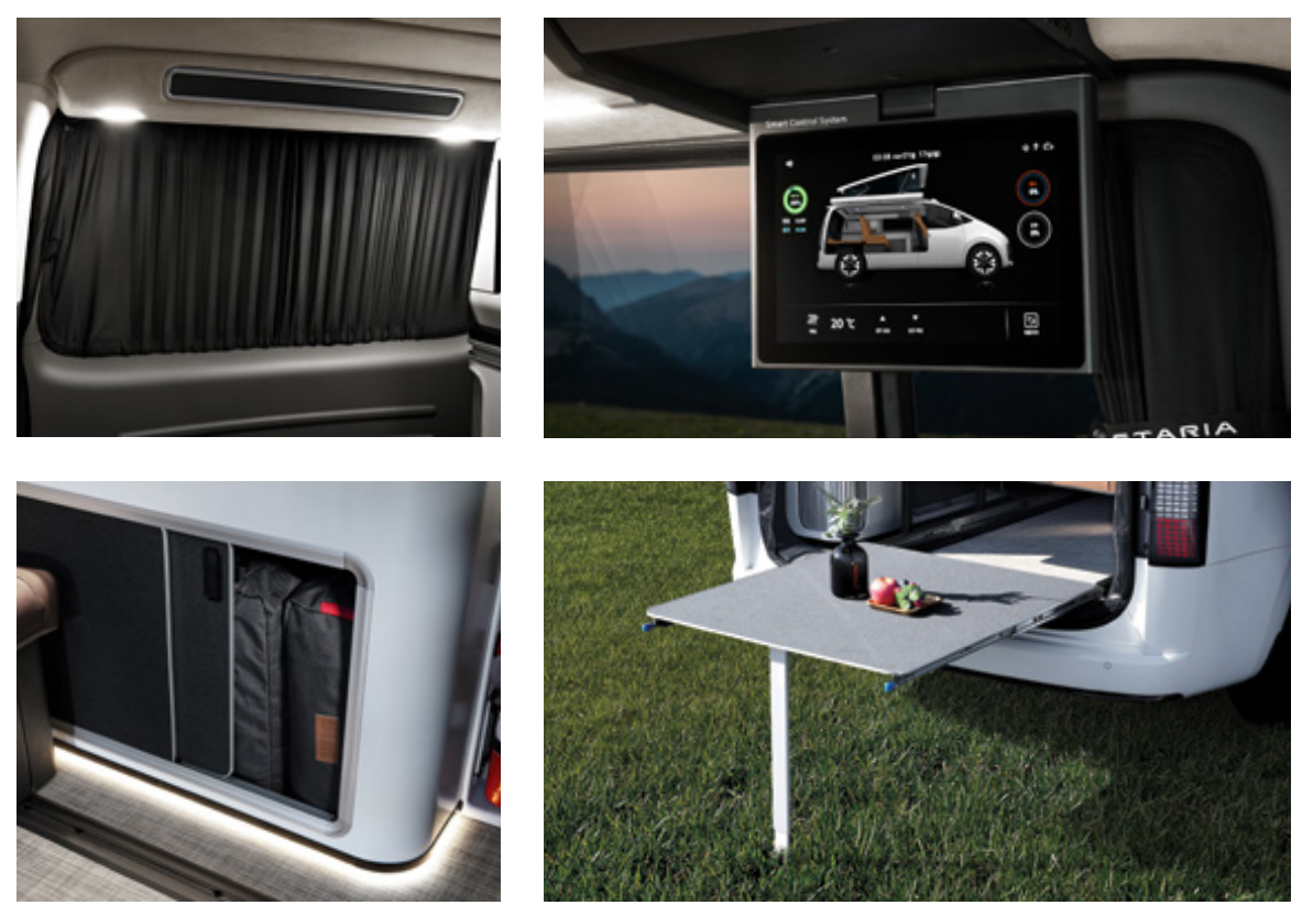 스타리아 캠핑카의 외관은 미래지향적 디자인을 자랑합니다. 대형 파노라마 윈도우와 세련된 헤드램프는 현대적인 감각을 한층 더 강조합니다.