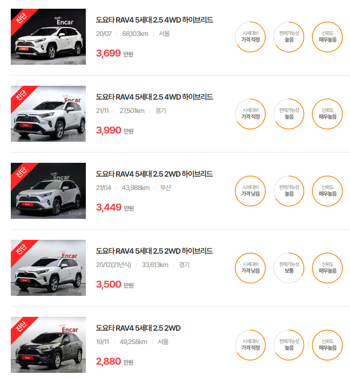2025년 6월을 기준으로, 토요타 RAV4 하이브리드의 중고차 가격은 아래와 같습니다.