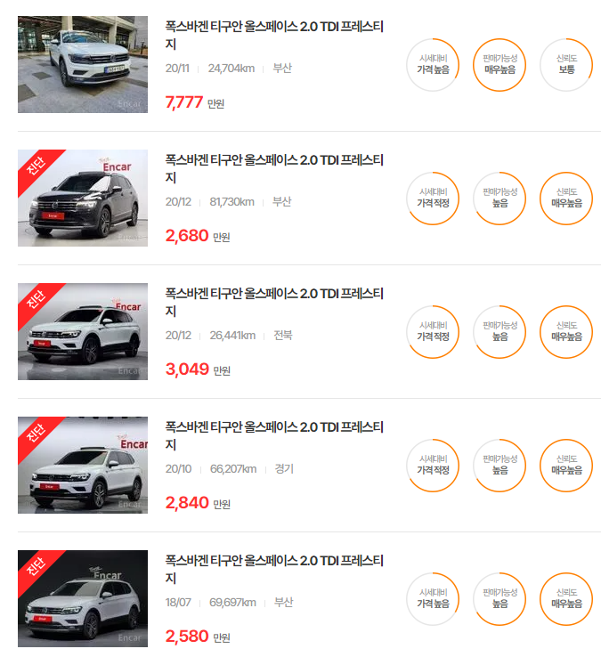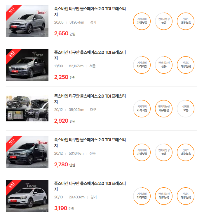 폭스바겐 티구안 중고차 가격 시세표 | 25년 6월