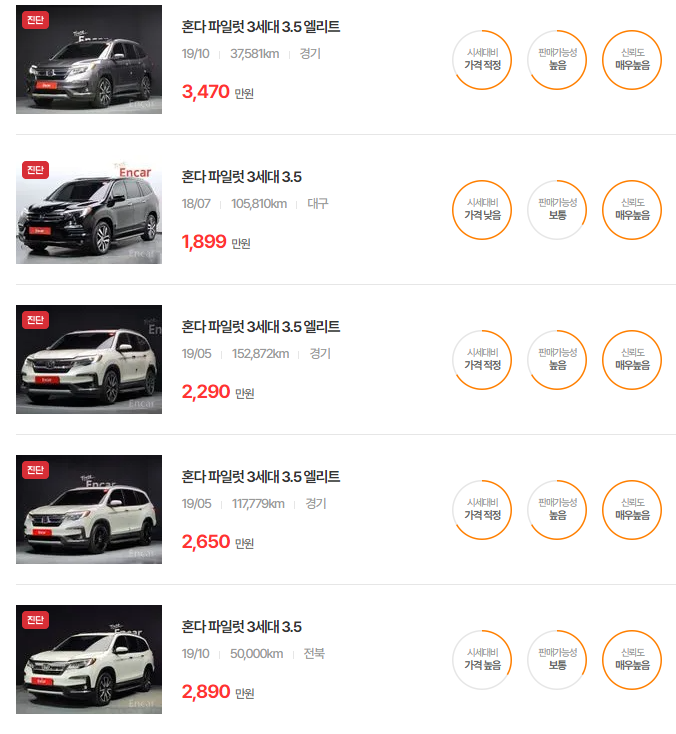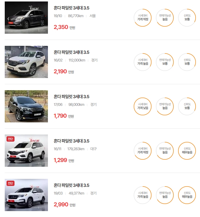 혼다 파일럿 중고차 가격