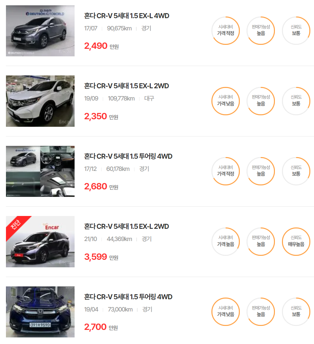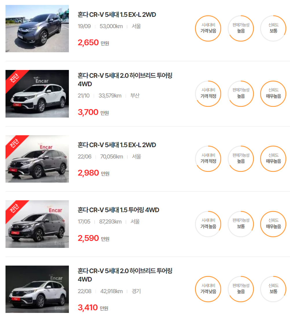 혼다 CR-V 중고차 가격 시세표 | 25년 6월 기준