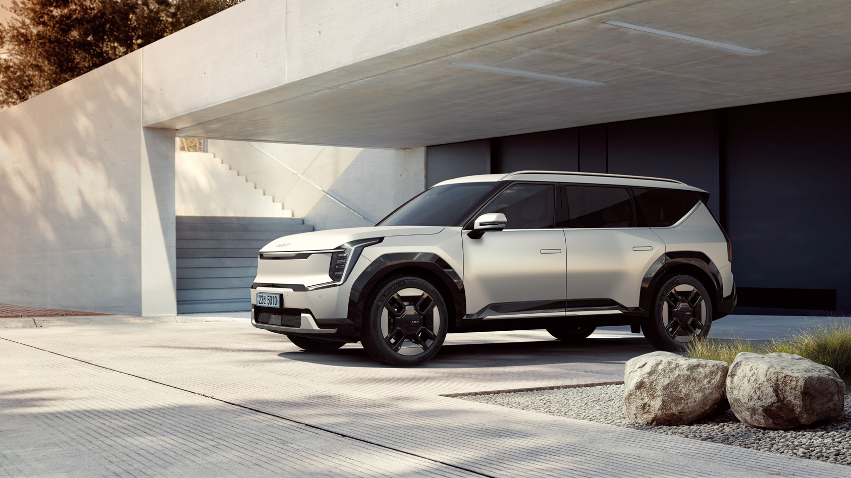2025 EV9는 날렵하고 현대적인 외관 디자인을 갖추고 있어 도로 위에서 눈에 띕니다. 특히 렌더링된 LED램프와 윤곽이 강조된 라인은 고급스러움을 더합니다.